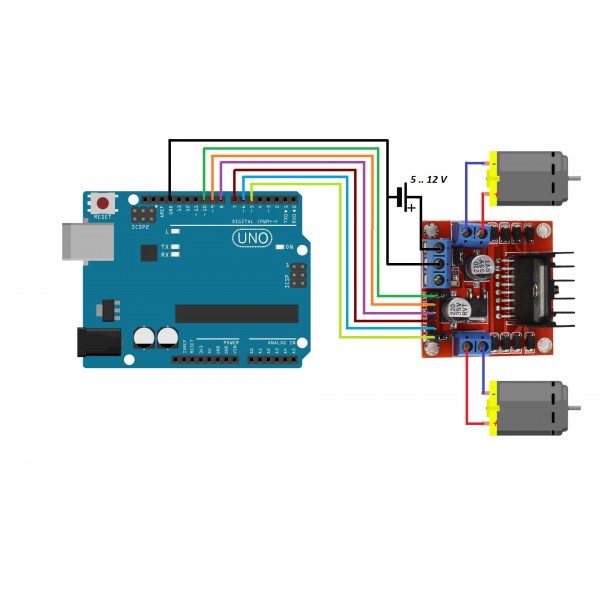 Son olarak Arduino dijital pinlerini sürücüye bağlayalım. Biz örneğimizde iki motor bağlıyoruz. Bu yüzden D9,D8,D7 ve D6 pinlerini IN1,IN2,IN3 ve IN4 e bağlıyoruz.