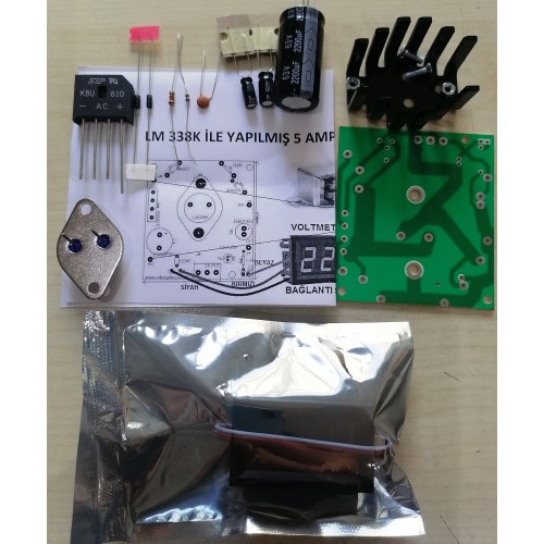 Devre demonte olarak gönderilecektir. Devrede LM338K ayarlı regülatör entegresi kullanılmıştır. elektronik ve elektrikle ilgilenen uzman ve amatörler için oldukça öneme sahip olan bir güç kaynağı kitidir. Devre O-30 volt ile 0-5 Amper arasında akım sağlayabilir.. lm338 k entegresi soğutucu ile gönderilmiştir. Soğutucu devreye transistör ile birlikte takılmalıdır. gönerilen civatalar. kart üzerine sabitlenmesi içindir. Devreyle beraber göndereceğimiz voltmetre devreye bağlanmıştır. devre içerisinde kutu ve trafosu kite dahil değildir. 2x12 yada 2x15 voltluk trafo kullanılabilir.