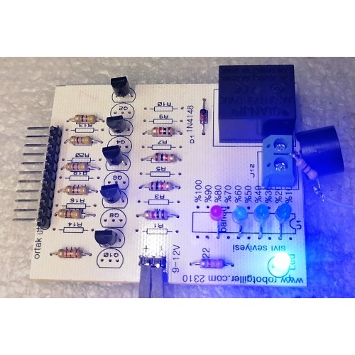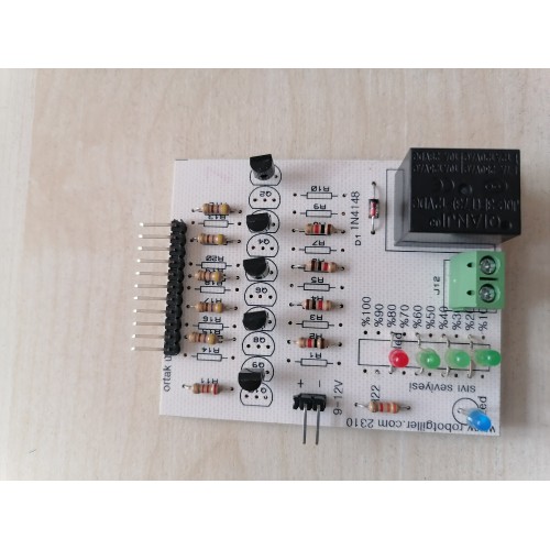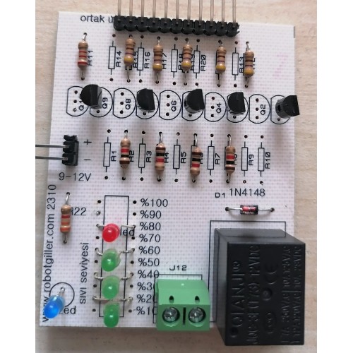 Belirli kademeye kadar( %20,%40,%60,%80,%100) bir kabın sıvı seviyesini ölçen bu devre led göstergelidir. Ölçüm kablolar vasıtasıyla yapılır.Bir kablo tabana,diğer kablolar belirli bir seviyede bırakılır.Her seviyenin ışığı farklıdır. Bu nedenle sıvının seviyesi belirlenmiş olur. seviye ölçümündeki kablolar tek damar bakır kablo olması tavsiye edilir.Devre max sıvı seviyesine (%100) ulaştığında röleye bağlı yük devreye girecektir.Ve herhangi bir yükü de kontrol etmiş olacağız. Devre 12 volt ile çalışır. 12 volt en az 1 amperlik güç kaynağı kullanmanızı tavsiye ederiz.